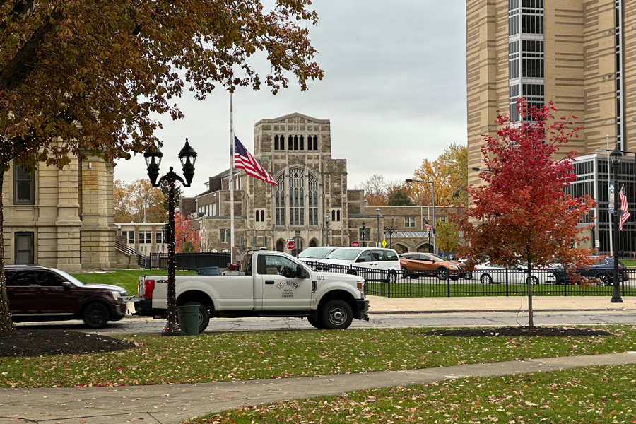The First United Methodist Church is framed by two Lorain County Court buildings.
